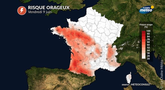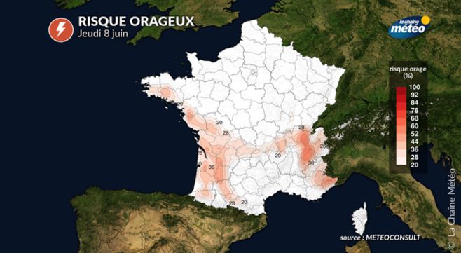 Avec la hausse de la pression atmosphérique, le risque orageux va perdre en intensité sur les régions du sud. Ce risque orageux va progressivement se limiter aux zones de reliefs (Pyrénées et Alpes). Toutefois, à partir de la nuit de jeudi à vendredi et vendredi, un risque orageux, faible, pourrait à nouveau se manifester par l'ouest en lien avec le creusement d'une dépression au large du Portugal qui remonterait vers le golfe de Gascogne.