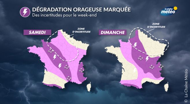 Alors que les orages, parfois violents, se cantonnaient au tiers sud de la France et particulièrement près des reliefs, ils commencent à se généraliser par l'ouest dès ce jeudi et surtout vendredi. Pour ce week-end, quelques incertitudes subsistent sur leur progression vers le nord-est.