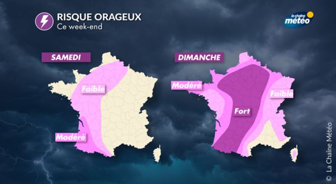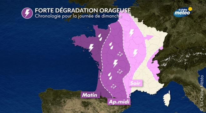 Dimanche, la situation sera dégradée dès le matin sur l'ouest avec l'arrivée d'une vague orageuse marquée. La chronologie de cette dégradation sera à affiner, mais ces orages pourraient progresser en cours d'après-midi sur une moitié ouest du pays, de la Normandie aux Pyrénées en passant par l'Ile-de-France et les régions centrales. Cette évolution s'annonce violente en cours d'après-midi et en soirée du sud-ouest au nord-est. Nos régions les plus à l'est vont connaître une très chaude journée estivale avant l'arrivée des orages en soirée. Ne vous laissez pas surprendre en montagne (Rhône-Alpes-Auvergne) où les orages pourront se former dès l'après-midi.