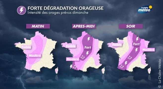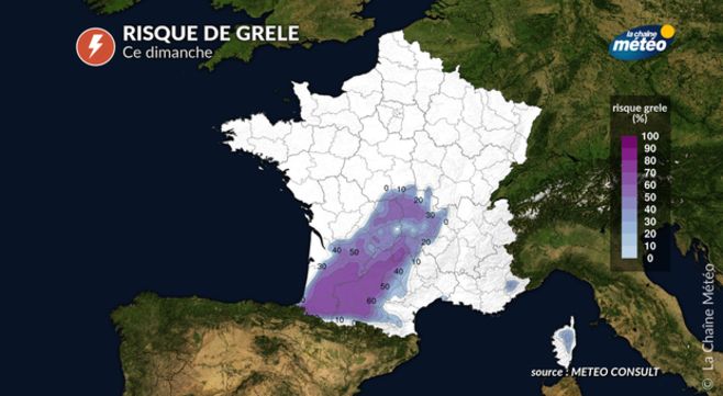 La dégradation orageuse se mettra en place dès le matin par l’ouest, après une nuit particulièrement douce. Des averses orageuses remonteront des plaines du sud-ouest à la Normandie, dans une ambiance lourde et tropicale. À l’est, le beau temps ensoleillé et chaud se poursuivra. C’est en deuxième partie d’après-midi qu’un axe orageux plus intense se formera de la Nouvelle-Aquitaine aux Hauts-de-France. Des phénomènes ponctuellement violents sont attendus avec de très fortes averses et un risque de grosse grêle (> 2 cm) élevé, notamment au sud-ouest.
