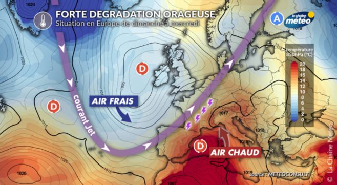 Après une journée très chaude et lourde samedi, qui pourra voir quelques orages éclater près de l'Atlantique, une dégradation orageuse de grande ampleur et bien organisée se mettra en place dimanche. Il pourrait s'agir de la plus forte dégradation depuis le début de l'année, traversant la France du sud-ouest au nord-est.