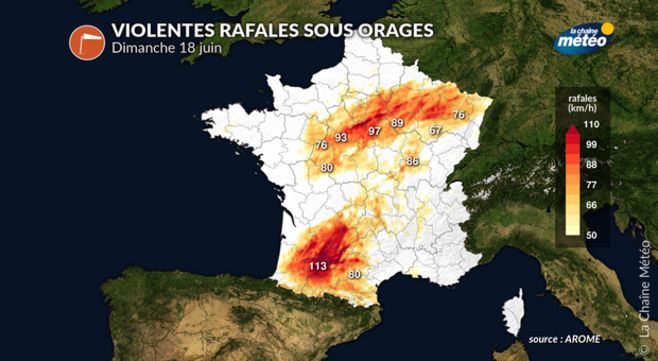 Des Pyrénées aux Hauts-de-France, il fait très chaud l'après-midi, sous un ciel qui se charge de gros cumulus et quelques orages isolés ponctuellement forts le soir dont il vous méfier. Le vent d'autan souffle fort dans son domaine, jusqu'à 70 km/h en rafales sur le Midi-toulousain et le sud du Massif central. Attention sous les orages au violentes rafales qui peuvent atteindre les 100 km/h ce soir !