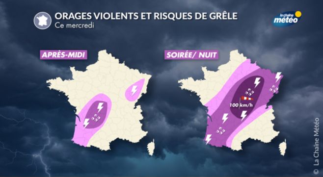 - Risque orageux toujours marqué du sud-ouest aux Ardennes, particulièrement forts au sud-ouest en soirée