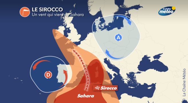 Le sirocco est un vent très chaud et sec qui prend naissance sur les sables du Sahara et remonte en direction de la Sardaigne et de la Corse lorsqu'une dépression se forme sur la partie ouest de la Méditerranée tandis qu'un anticyclone est présent sur la partie nord de l'Italie.