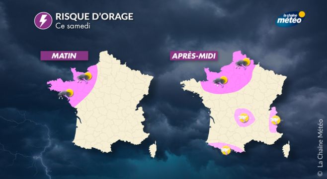 Le temps devient de plus en plus lourd avec une masse d'air plus humide qui s'infiltre par la Manche et l'Atlantique. Dès le matin, un front pluvio-orageux donne des pluies orageuses entre Pays-de-la-Loire, le Bassin rennais et la Basse-Normandie. Dans l'après-midi, les averses orageuses gagnent vers le Bassin parisien et la Haute-Normandie en circulant de manière très aléatoire. Les Hauts-de-France seront touchés en fin de journée par les orages.