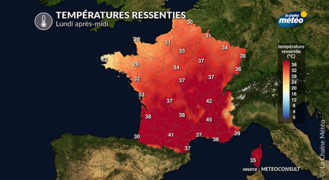 L'après-midi, le ressenti pourra atteindre 40 à 45 du sud de Rhône-Alpes à Midi-Pyrénées.