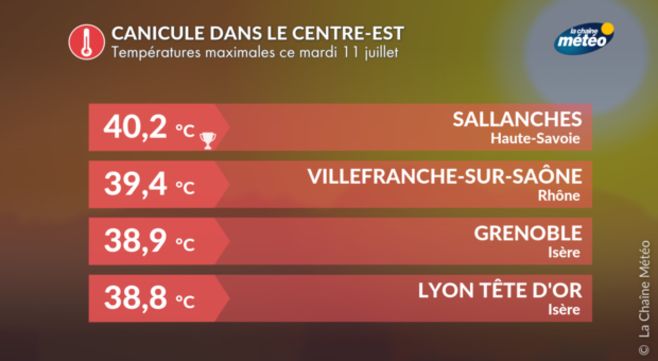 Une période de fortes à très fortes chaleurs s’est installée sur la moitié est entre vendredi 7 et mardi 11 juillet. D’ailleurs, une alerte canicule a été lancée par nos services, pour le nord de la région Rhône-Alpes et une partie de la vallée du Rhône, de la région PACA et de la Corse. Ce mardi, les températures ont atteint des sommets avant les orages, jusqu’à 40,2°C à Sallanches en Haute-Savoie, 38,9°C à Savigneux dans la Loire, 37,5°C à Lyon Bron dans le Rhône ou 37,3°C à Dijon (Côte-d’Or) et Vichy (Allier).