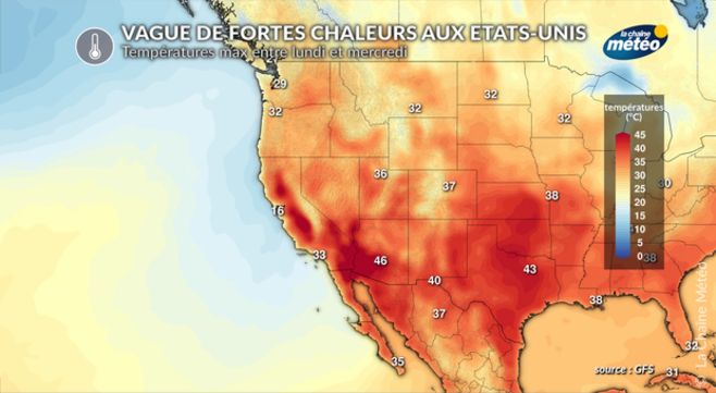 C’est tout le sud des États-Unis qui est concerné par une vague de fortes chaleurs avec des valeurs souvent comprises entre 40 et 46°C du Texas au sud de la Californie, en passant par l’Arizona et le Nevada. En tout, ce sont 70 millions de personnes, soit 21% de la population américaine, qui sont concernées par ces très fortes chaleurs. L’indice de chaleur (heat index) qui prend en compte la température sous abri et l’humidité, atteint des niveaux dangereux pour la santé. C’est en particulier proche du golfe du Mexique, notamment en Floride, que l’indice de chaleur pourra atteindre des valeurs extrêmes autour de 41 à 43°C. On rappelle que chaque année des centaines d’Américains meurent en raison des chaleurs extrêmes.