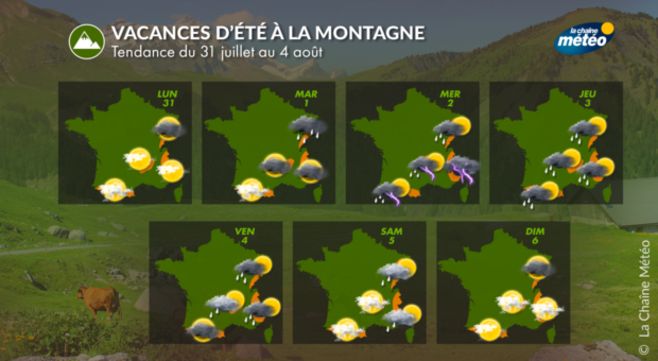 Le début de semaine sera calme puis le temps deviendra dégradé dans l'est. D'autres orages pourront éclater en fin de semaine. Si vous souhaitez randonner en haute montagne, il conviendra de suivre les actualisations quotidiennes de nos prévisions par massifs.