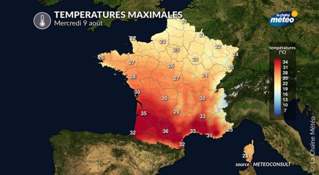 Une perturbation atlantique apportera un temps plus nuageux et menaçant sur le nord-ouest en matinée. Ailleurs, malgré un ciel souvent voilé, la chaleur deviendra lourde l'après-midi. Une dégradation orageuse est attendue en soirée des Charentes au bassin parisien et aux Ardennes. Les températures baisseront par l'ouest, mais l'ambiance restera lourde et toujours très chaude au sud-est. Elles évolueront de 21 à 38°C de la Bretagne à la vallée du Rhône.