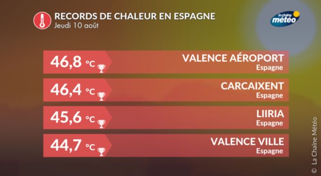 En Espagne, le pic caniculaire a été atteint ce jeudi 10 août avec des valeurs records sur l'est du pays, notamment sur la province de Valence. La levée d'un vent de terre a exacerbé cette chaleur brulante : on a relevé 46,8°C à l'aéroport, battant le précédent record de 43,4°C de juillet 1986. On a relevé aussi 44,4°C à Valence-Vivers et 39°C à Valence ville, proche de la mer.