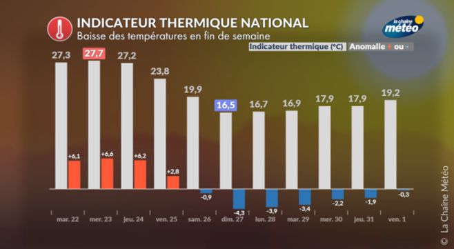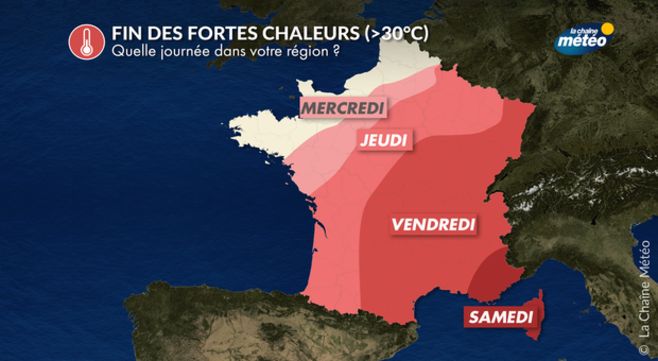 L'évolution à partir de jeudi devient moins fiable, et il faudra attendre vendredi pour qu'une baisse se mette en place sur la moitié nord avec les orages. Vendredi devrait marquer la fin des fortes chaleurs avec un temps devenant instable, nuageux et orageux. Ce sera la délivrance pour ces régions. Une masse d'air océanique nettement rafraichie envahira toute la France. Seules la PACA et la Corse pourraient connaître un ultime jour de fortes chaleurs. Cette évolution pourrait nous faire perdre 10 à 20°C en 72 heures sur les régions de la moitié sud de notre pays entre mercredi et vendredi.