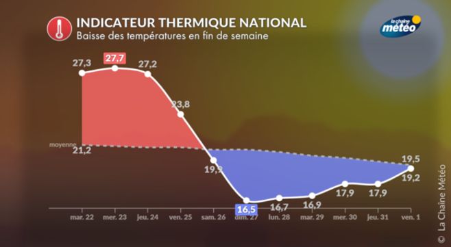 Cette semaine, la canicule se maintient sur les 3/4 du pays jusqu'à vendredi. À partir de vendredi et surtout samedi, une dégradation marquée est attendue avec des orages localement forts et violents annonçant la fin de cette vague de chaleur inédite par son intensité, sa durée et son caractère tardif.