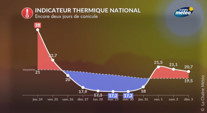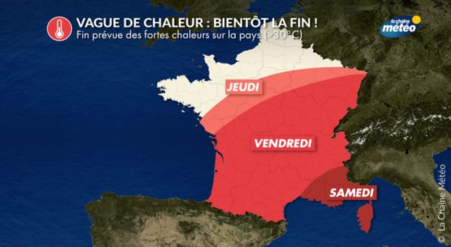 Après une semaine de blocage anticyclonique associé à un dôme de chaleur sur la partie sud du pays, la situation météo va rapidement évoluer à partir de jeudi. L'anticyclone va se décaler vers l'Europe Centrale tandis qu'une dépression va remonter du golfe de Gascogne vers le nord-est en faisant circuler une masse d'air plus humide et instable avec le retour des orages. Après le passage de ces orages, le flux s'orientera au nord-ouest dès vendredi, ramenant de l'air océanique plus frais en provenance des Iles Britanniques. Les régions du sud-est conserveront encore des températures très élevées tandis qu'une nette baisse des températures concernera les régions allant du sud-ouest au nord-est et au centre-est. Samedi, l'ensemble du pays sera sorti de l'épisode de canicule même si les températures avoisineront encore les 30°C sur l'extrême sud-est et la Corse.