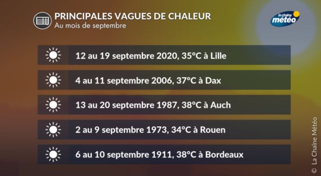 Des vagues de chaleur en première quinzaine de septembre ne sont pas rares. Il faut remonter à l'année dernière pour en trouver une, avec un pic de chaleur record le 12 septembre : il avait alors fait jusqu'à 30°C dans le Finistère, 35°C à Nantes et ponctuellement 40°C dans les Landes. Les plus grandes vagues de chaleur en septembre ont été enregistrées en 2020 et surtout 2016. Les plus intenses se sont produites en 1973 et 1949.