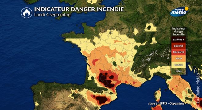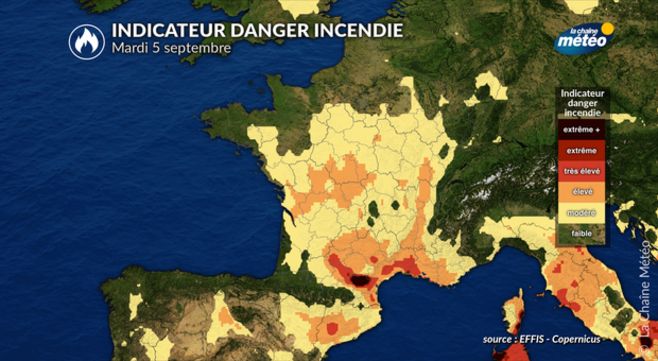 Avec la forte chaleur et le turbulent vent d'autan qui s'installe pour plusieurs jours en Occitanie, cette région est la plus à risques concernant les départs de feux et d'incendies sur la végétation. Ce risque remonte également vers le centre du pays, toujours pour les mêmes raisons, à savoir de fortes chaleurs persistantes et un vent de sud-est asséchant, faisant drastiquement baisser le taux d'humidité de l'air, ce qui est hélas propice au renforcement du risque de départs de feux.