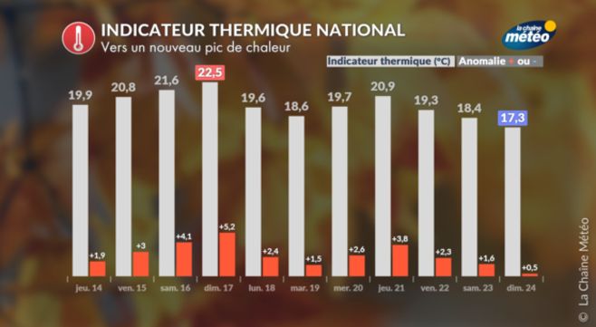 Si les températures ont baissé après les orages, elles restent encore supérieures de l'ordre de +2°C par rapport aux moyennes à l'échelle de l'hexagone. Elles vont remonter surtout à partir de vendredi, pour culminer dimanche à l'échelle du territoire.