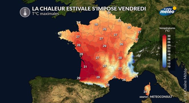 Vendredi, le beau temps bien ensoleillé s'impose. Après des températures agréables le matin, les valeurs sont en hausse l'après-midi, avec de 24 à 32°C du nord au sud. C'est en Aquitaine qu'il fera le plus chaud.