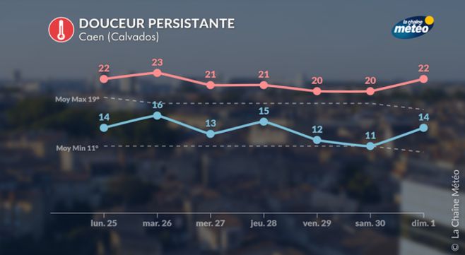 Dans le nord, en raison des nuages, les températures, seront moins élevées. Néanmoins, le ressenti sera plus estival qu'automnal. Ente Rennes, Paris, Lille ou Metz, les 20 à 22°C seront atteints quotidiennement.