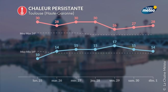 De lundi à vendredi prochain, il fera chaud dans le sud du pays. Au sud d'une ligne Bordeaux / Lyon, la barre des 25°C sera atteinte quotidiennement. Dans la vallée de la Garonne, pendant cette même période, on atteindra fréquemment les 30°C. On se situera 4 à 7°C au-dessus des normales, avec des valeurs dignes d'un plein été.