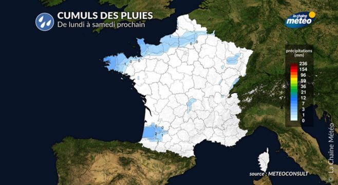 En raison de pressions élevées, la semaine à venir s'annonce sèche : aucune pluie n'est prévue sur les 2/3 du pays. Sur un petit tiers nord, excepté mercredi et jeudi où une perturbation apportera quelques faibles pluies éparses, le temps s'annonce généralement sec.