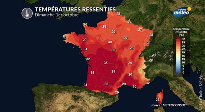 Ce qui change par rapport à samedi, c'est le retour du beau temps partout. De plus, la chaleur s'accentue, la barre des 30°C est atteinte et dépassée au sud d'une ligne Rennes / Bourges / Lyon. En plein soleil, le ressenti atteindra et dépassera souvent les 30° sur les 2/3 du pays l'après-midi. La chaleur pourra se montrer torride en plein soleil !