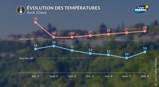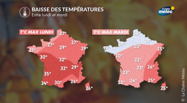 À son passage, les températures vont chuter d'une bonne dizaine de degrés sur les 3/4 du pays, excepté de l'Alsace au Lyonnais où la chaleur résistera en journée, avant l'arrivée des averses le soir.