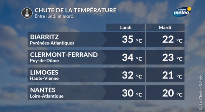Cette baisse de la température sera d'autant plus ressentie que l'on sera parti de très haut, avec des températures très élevées et un ressenti torride lundi après-midi. Vous ressentirez d'autant plus la différence que vous aurez un ciel très nuageux accompagné de quelques pluies, et que le vent de nord-ouest soufflera de manière assez sensible.