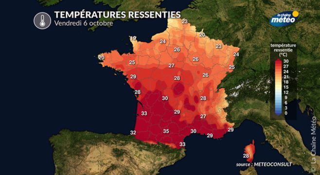Ce vendredi 6 octobre, après un début de matinée à nouveau très frais, il fera chaud l'après-midi sur une large moitié sud. La barre des 30°C sera à nouveau atteinte localement dans le sud-ouest.