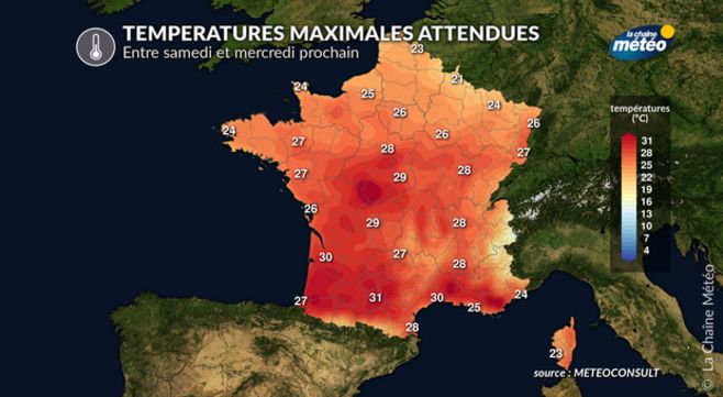 Les conditions météorologiques sèches et ensoleillées de cette semaine se prolongent ce week-end, accompagnées d'une hausse des températures. L’après-midi, le mercure dépassera les 30°C sur une large partie du sud-ouest de la France, atteignant même 32°C en Nouvelle-Aquitaine et Occitanie. Au nord, les températures dépasseront les 25°C, avec des pics avoisinant 28-29°C dans les régions centrales. Ces températures, supérieures de +5 à +10°C par rapport aux normales saisonnières, sont typiques de celles que nous connaissons en plein été. Toutefois, contrairement au week-end dernier, les records d'octobre ne devraient pas être battus cette fois-ci.