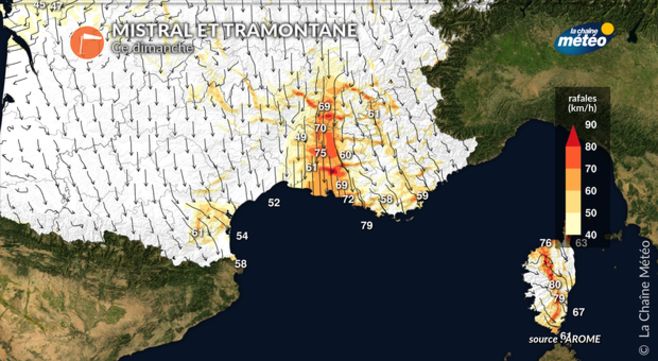 - présence du mistral et de la tramontane à 70 km/h en rafales