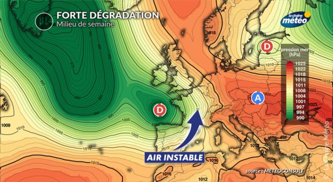 Avec le creusement d'un profond système dépressionnaire sur l'Atlantique, au large de l'Espagne, à partir de lundi, le temps va commencer à se dégrader dans le sud de la France. Ce système dépressionnaire gagnera au cours de la semaine toute la France. Comme la masse d'air sera très instable et ce système dépressionnaire peu mobile, il faut craindre une situation de blocage à l'origine de plusieurs épisodes d'intempéries de mardi à vendredi prochain.