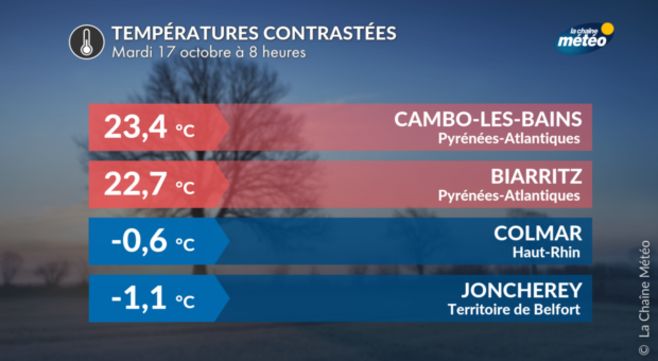 Températures très contrastées en début de journée avec de faibles gelées sur l'extrême nord-est alors que l'on dépasse les 20°C par effet de foehn sur la côte basque