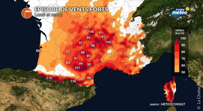 Dès la matinée de lundi, le vent de sud soufflera en tempête sur les cimes Pyrénéennes avec des rafales dépassant les 140 km/h. Le vent d’autan se renforcera également, tout comme le vent de sud-est sur le Massif central, avec des rafales entre 90 et 100 km/h et quelques pointes au-delà de 110 km/h. Dans l’après-midi, le vent de sud se renforcera aussi sur le centre-est, avec des rafales approchant les 90 à 100 km/h, ainsi que le vent marin autour du golfe du Lion, avec des rafales à 80 km/h. Ces conditions provoqueront une forte houle en Méditerranée, avec des vagues dépassant les 3 mètres sur les côtes du Languedoc-Roussillon. Les fortes rafales perdureront une bonne partie de la nuit dans la région Auvergne-Rhône-Alpes.