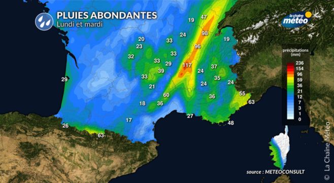En parallèle au fort coup de vent, les pluies débuteront sur le Languedoc-Roussillon lundi matin, restant faibles au départ. Elles se renforceront dans l'après-midi, puis en soirée, se concentrant principalement sur les Cévennes et la Montagne noire. C'est avec l'arrivée du front froid par l'ouest dans la nuit de lundi à mardi que la situation deviendra délicate, avec des pluies diluviennes et de très fortes intensités horaires. Le front pluvio-orageux s'étendra en milieu de nuit de lundi à mardi des Cévennes au nord de l’Auvergne-Rhône-Alpes et à la Bourgogne. Ces pluies couvriront tout le quart sud-est, jusqu'à PACA et la Corse en cours de matinée de mardi sans caractère aggravant, raison pour laquelle nos services n'ont pas émis d'alerte pour ces régions.