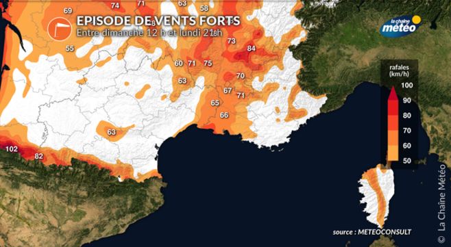 Dès dimanche après-midi, le vent de sud soufflera fort sur le Massif central avec des rafales autour de 70 à 80 km/h. Dans l’après-midi, le vent de sud se renforcera aussi sur le centre-est, avec des rafales approchant les 80 km/h, ainsi que le vent marin autour du golfe du Lion, avec des rafales à 70 km/h.