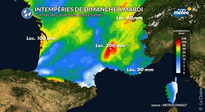 En parallèle du coup de vent au sud, les pluies débuteront sur le Languedoc et la Provence côte d'Azur, restant faibles au départ dimanche matin. Elles se renforceront dans l'après-midi, puis en soirée et dans la nuit de dimanche à lundi en se concentrant principalement sur les Cévennes et la Montagne noire. C'est avec l'arrivée du front froid par l'ouest dans la journée de lundi que la situation se compliquera avec des pluies abondantes et de fortes intensités horaires. Ce front pluvio-orageux ondulera des Cévennes au nord du Jura à la Bourgogne toute la journée. Ces pluies couvriront tout le quart sud-est, jusqu'en PACA et perdureront toute la nuit de lundi à mardi, ce qui laisse craindre d'importants cumuls et des risques ponctuels d'inondations. Une amélioration est attendue mardi matin avec l'évacuation des pluies et des orages hors de nos frontières.