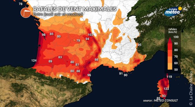 Rafales de vent maximales entre jeudi soir et vendredi © La Chaîne Météo