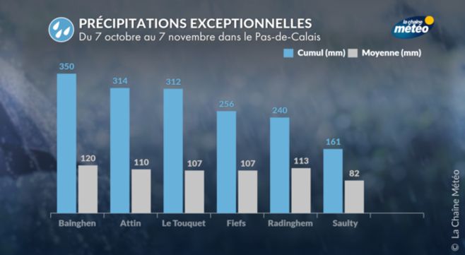 En un mois, du 7 octobre au 9 novembre 2023, il est tombé plus de 300 millimètres de pluies sur une zone géographie située entre la côte d'Opale et les collines du Boulonnais et de l'Artois. Il a été relevé 350 mm à la station du Touquet (normale 107 mm) et jusqu'à 390 mm à Bainghen (normale 120 mm) sur les hauteurs de l'arrière-pays. En revanche, les cumuls de pluie sont beaucoup moins importants dans la plaine de Flandres, sous le vent des collines, dans l'est du département. Il a été relevé par exemple 180 mm à Lillers, soit 2 fois moins de précipitations qu'à la station du Touquet.