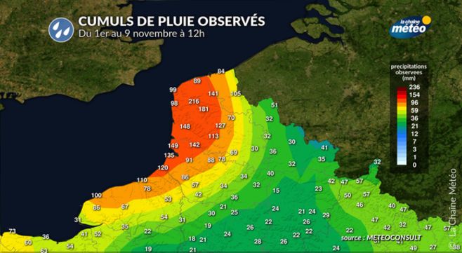 260 mm de pluies sont tombés près de Bainghen dans le Pas-de-Calais depuis le 1ᵉʳ novembre. C’est l’équivalent de deux mois de précipitations sur la zone. Le bassin hydrologique des Haut-de-France subit les assauts réguliers de pluies. Trois causes expliquent cette situation critique :