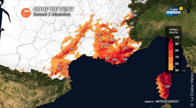 Près de la Méditerranée, le soleil brille, mais mistral et tramontane soufflent fortement, à près de 100 km/h en rafales en Roussillon et en Provence. En Corse, une tempête frappe l'île avec des rafales à 150 km/h près des caps et côte exposés ainsi qu'en montagne. Le ressenti est glacial en plein vent.