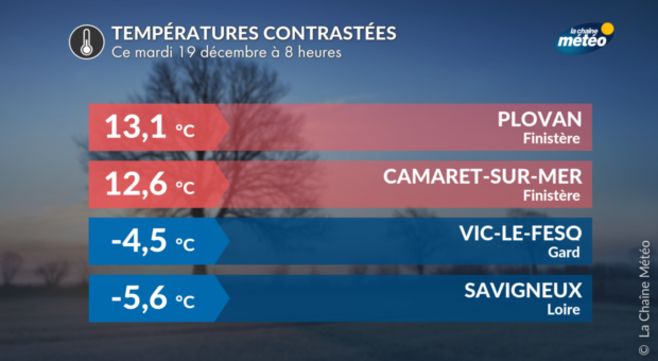 La pluie est de retour par les côtes de la Manche dans un flux de secteur sud-ouest plus doux. Ailleurs, les brouillards sont fréquents et souvent givrants et le gel est parfois marqué entre le nord-est et le centre-est.