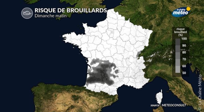 Dans l'ouest, le temps est plus calme, mais très nuageux. Attention aux brouillards qui sont nombreux le matin dans les plaines d'Aquitaine. Ils peuvent fortement réduire les visibilités et avoir du mal à se dissiper.