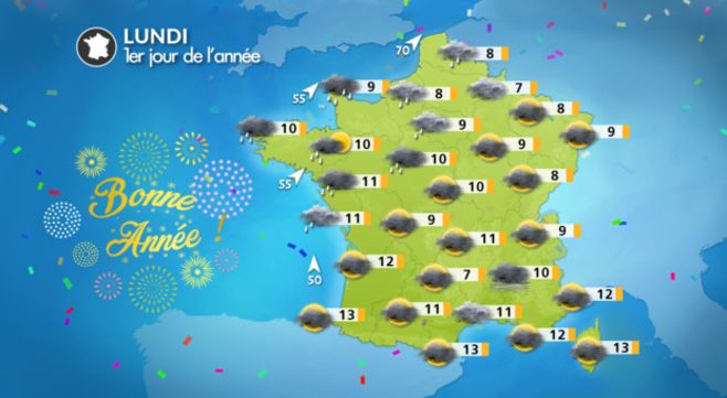 Les 2/3 du pays seront exposés à quelques pluies ou averses pour le soir du réveillon. Les averses seront fréquentes près de la Manche avec du vent fort. Du centre au Grand Est au nord des Alpes, le temps sera instable avec des averses. Il neigera des Vosges aux Savoies, dès 900 à 1200 mètres. Si vous êtes entre les Pyrénées, le sud de Rhône-Alpes et les régions méditerranéennes, vous devriez bénéficier d'un temps plus calme.