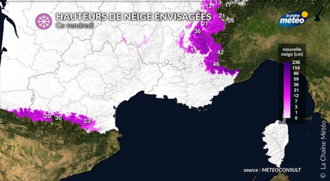 Vendredi matin, la neige commencera à tomber sur les Alpes entre 1200 et 1800 mètres du nord au sud. Il neigera aussi fortement sur le sud du Massif central dès 1200 mètres. Dans l’après-midi, avec l’intensification des précipitations et l’absence de vent, un risque d’isothermie n'est pas exclu avec l’abaissement de la limite pluie/neige, possiblement vers 800 mètres sur le Massif central, et entre 1000 et 1200 mètres sur les Alpes.