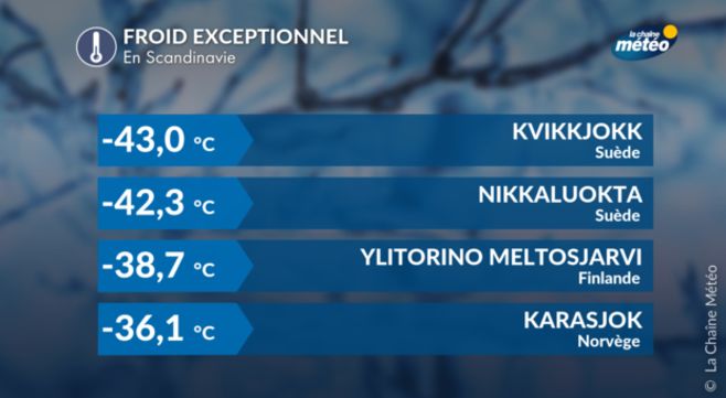 La température a plongé à -43°C dans le nord de la Suède mardi matin. Il s'agit de la seconde température la plus basse depuis janvier 1999 pour ce pays. On se situe 15 à 20°C en dessous des normales de saison pour un début de mois de janvier.