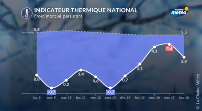 Pour qu'une vague de froid soit identifiée au niveau national, il faut que l'indicateur thermique national soit inférieur à 0,9°C pendant au moins trois jours, et que la température moyenne nationale descende au moins une journée sous le seuil de -2°C. La semaine prochaine, nous aurons 4 journées où l'indicateur thermique national se situera en dessous de 0,9°C, mais aucun pic à -2°C au niveau national n'est attendu sur 1 jour durant l'épisode. On se dirige donc vers un épisode de froid, particulièrement marqué dans le nord et sur l'est du pays.