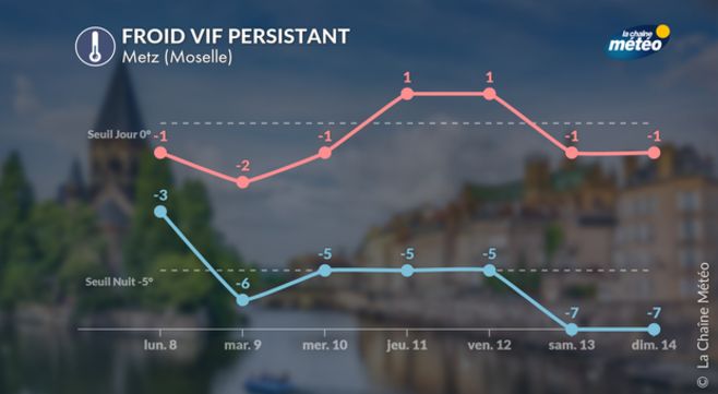 L'est du pays est la région la plus exposée avec un froid qui s'annonce sévère, et plusieurs journées sans dégel dans le nord et sur l'est du pays. Les températures plongeront jusqu'à -10 à -15°C localement la nuit dans les combes, les trous à froid et certains fonds de vallées. À Strasbourg, aucun dégel n'est prévu pendant plusieurs jours, de dimanche soir à jeudi.