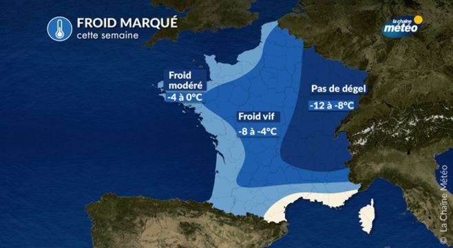 Des régions bordant la Manche à la façade atlantique, le froid est également marqué, et on ne peut exclure un ou deux jours sans dégel de Lille à Rennes en passant par Rouen et Alençon.