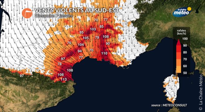 Sur les régions méditerranéennes, le mistral et la tramontane se lèvent et soufflent en tempête le soir, jusqu'à 120 km/h. Ce vent violent accentue le ressenti glacial.